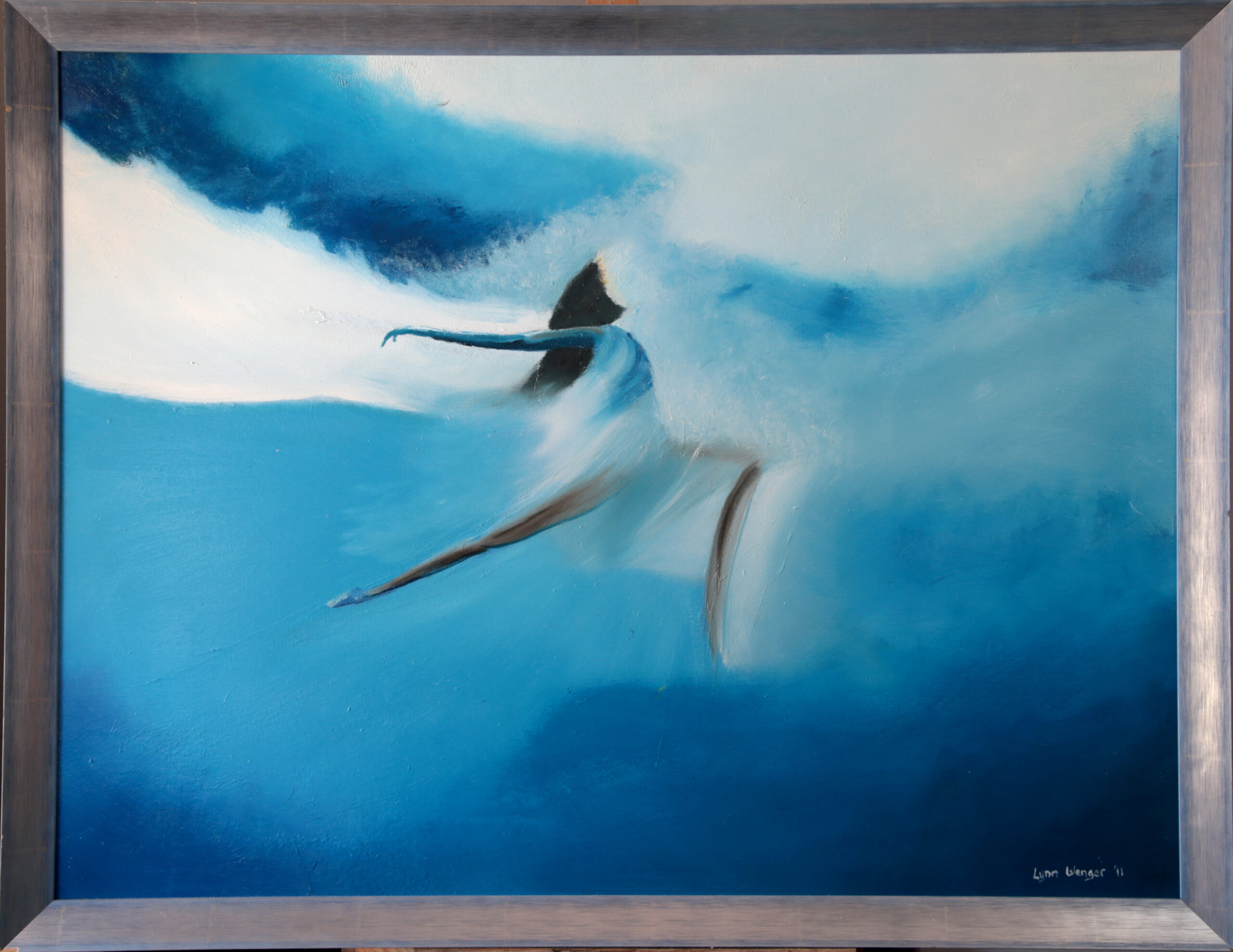 The original oil painting on canvas comes with a custom silver brushed frame. The painting depicts a bold and powerful impression of a feminine figure, emerging from the depths of a cerulean and aquamarine blue background. The figure is rendered in strong, flowing lines that convey a sense of movement and expressiveness. The use of these cool blue hues creates a deep, emotional atmosphere that adds to the intensity of the figure’s emergence. The figure appears to be breaking free from the background, giving the impression of freedom and liberation. The brushstrokes are fluid and confident, lending the piece a sense of movement and energy. Overall, this is a powerful and emotional image that captures the essence of expression and freedom, using the fluidity of color and brushwork to create a dynamic and captivating composition.