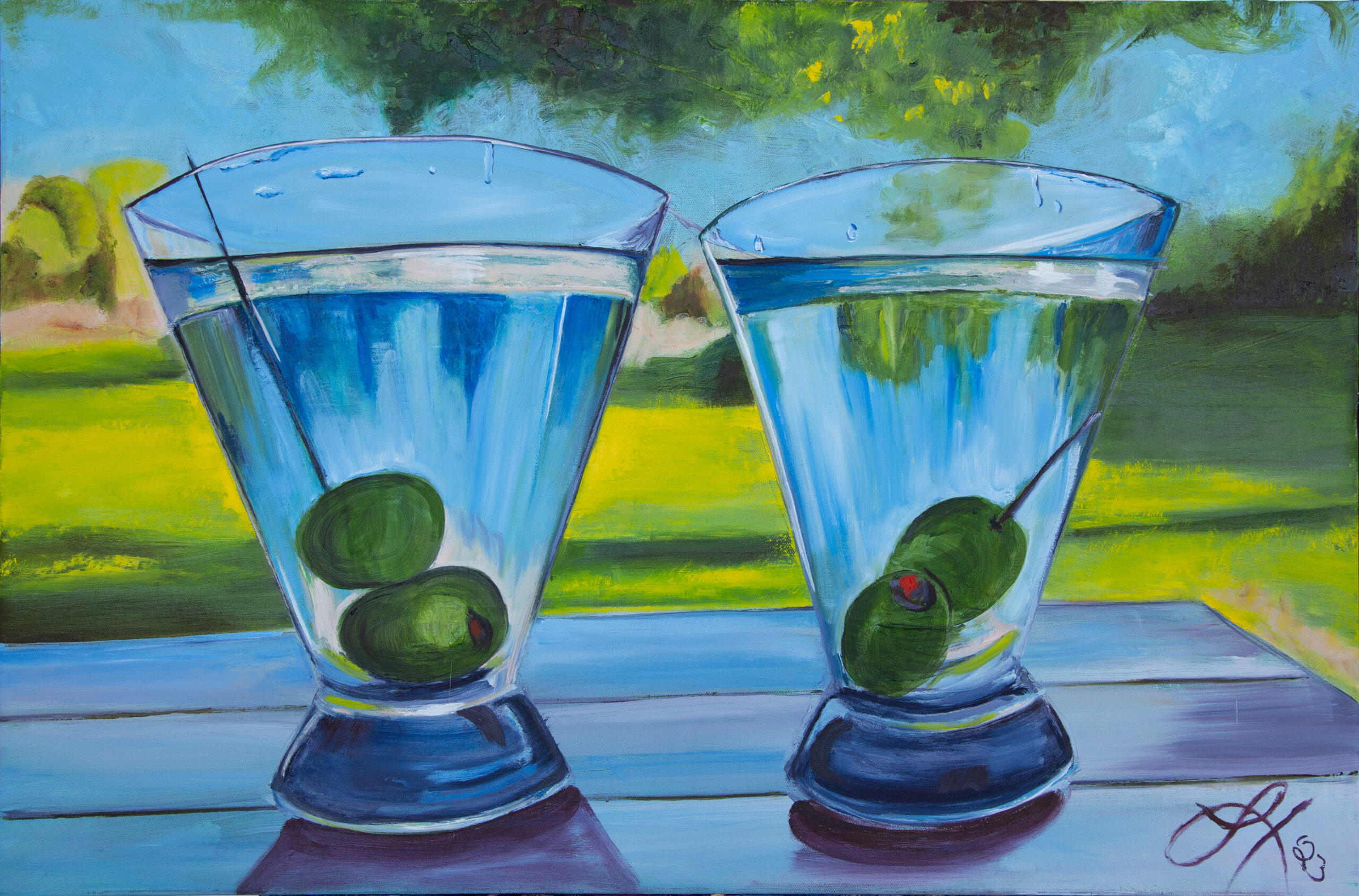 After a long day at work and staring at computers, one of my favorite ways to wind down is to sit in the swinging chairs under the trees in the yard with my husband and martinis. On one day in particular, while he and I sat in our favorite spot, I stopped and noticed that I was perfectly content and at peace. While I observed this feeling, I noticed how the landscape looked brighter and that it was being reflected in our still full martini glasses. I captured this moment first in a photo, and later I decided I needed to paint it as part of my water study. You can see the arc of the surface of the water, the reflection of the trees and sky in the liquid, and water drops clinging to the top of the glass.