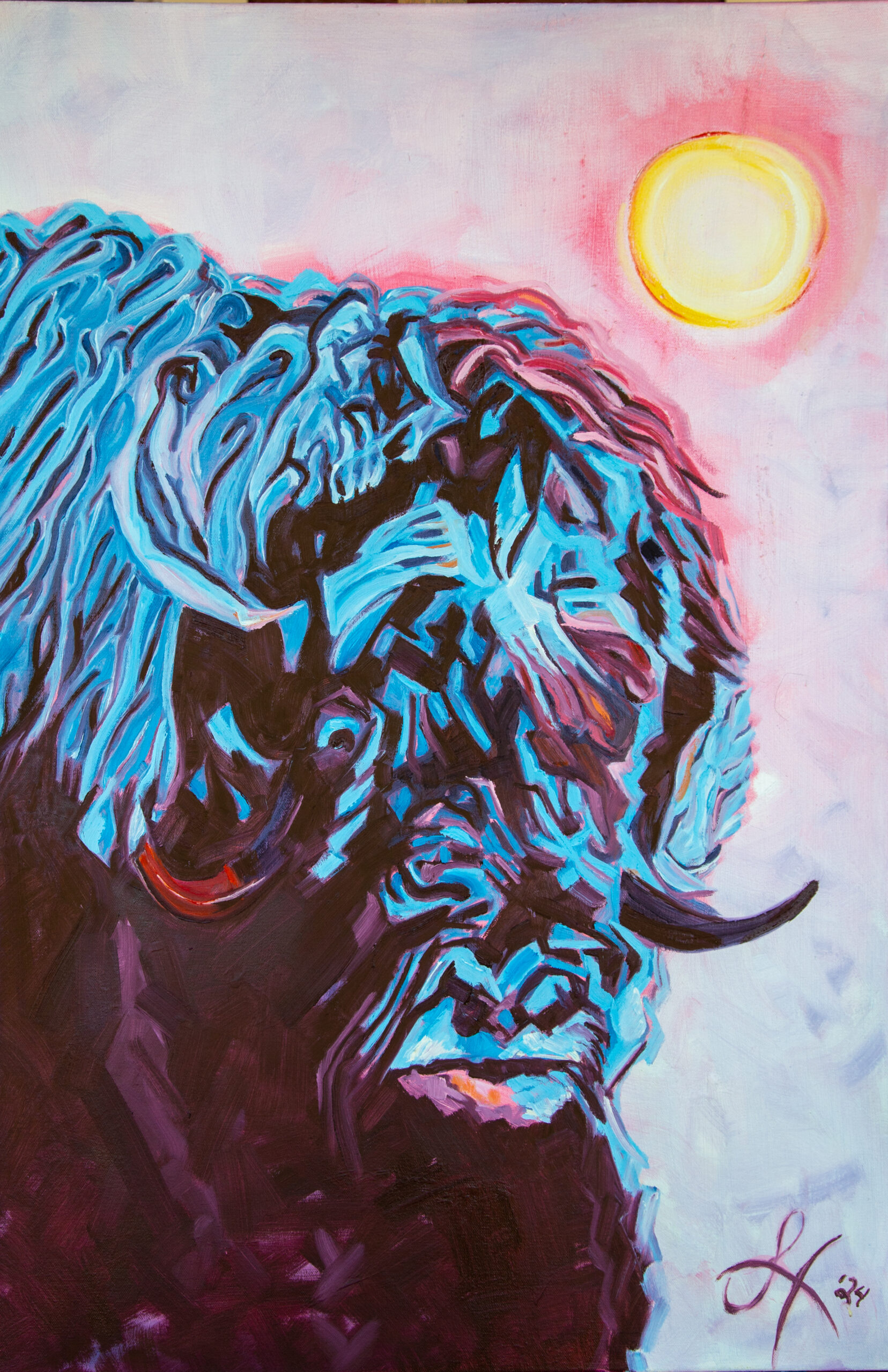 Russell is a well-known muskox who is thought to be over 100 years old and roams the wilds of Alaska. This image was first captured by a friend (of a friend). When I saw the photo, I immediately fell in love with it and had to paint him, in my own style of course. With his protruding horns and mane of dreadlocks, you can see that Russell is a force to be reckoned with.